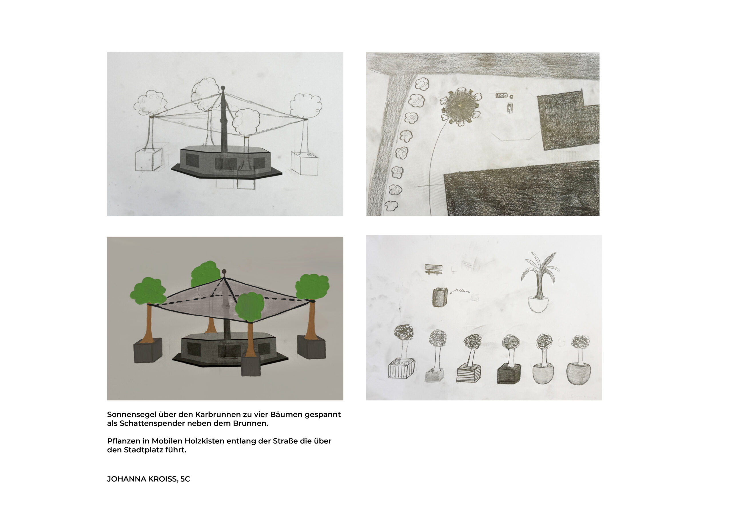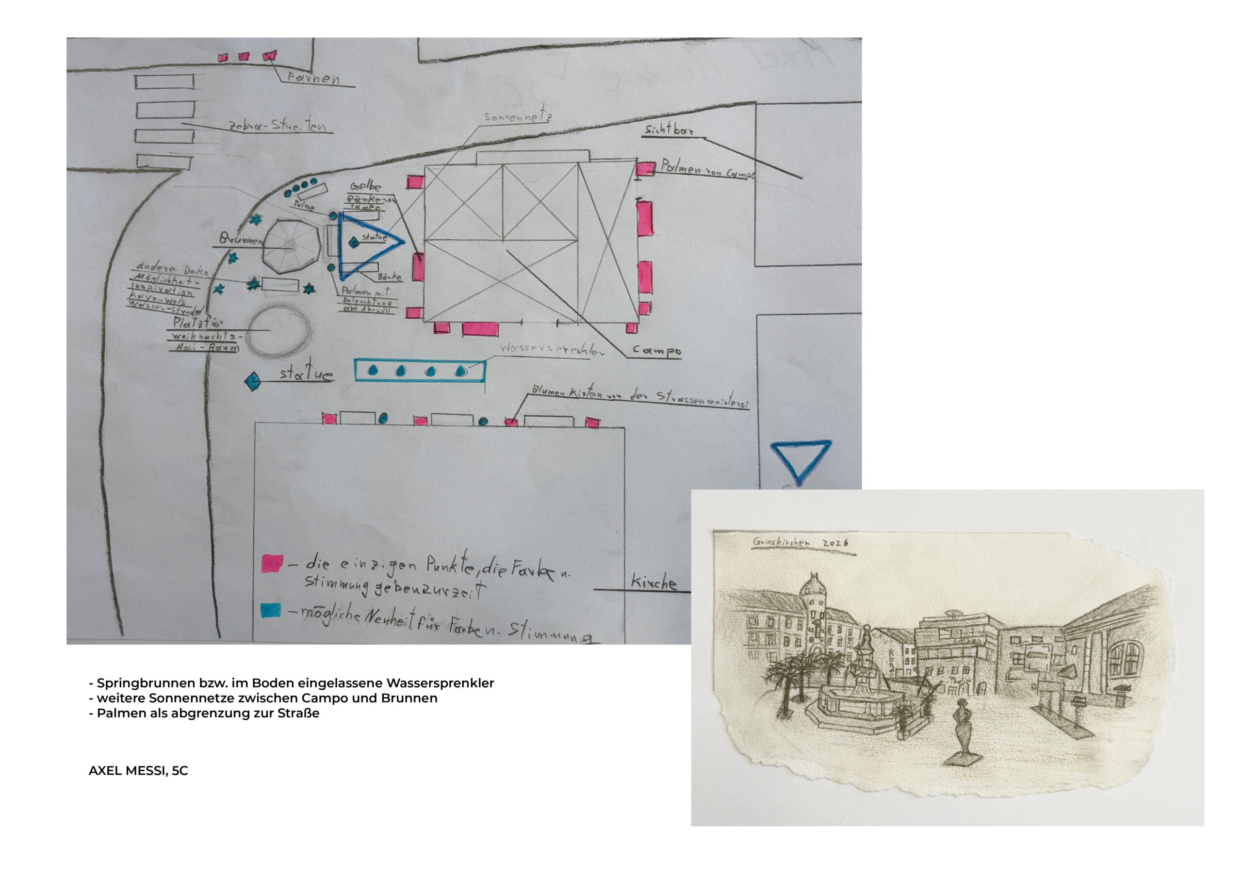 Die Schülerinnen und Schüler der Klasse 5c haben sich in den vergangenen Wochen im Fach Kunst und Gestaltung mit der Gestaltung des Grieskirchner Kirchplatzes beschäftigt. Dabei entwickelten sie zahlreiche kreative Gestaltungsideen und setzten diese visuell um.